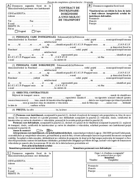 Contractul de înstrăinare-dobândire auto este un document legal care transferă proprietatea unui vehicul de la vânzător la cumpărător. Acest document trebuie să fie semnat de ambele părţi şi trebuie să includă următoarele informaţii: